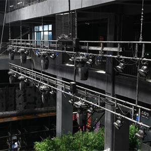 在燈架下沿,每側(cè)配若干套“日”字型燈光排架,用于懸掛燈具,燈光排架可手動使之在垂直臺口方向移動,燈架可整體升降。燈光排架可根據(jù)需要上下疊加。也有用雙層燈光吊桿桿體硬聯(lián)接組成的掛燈結(jié)構(gòu)。