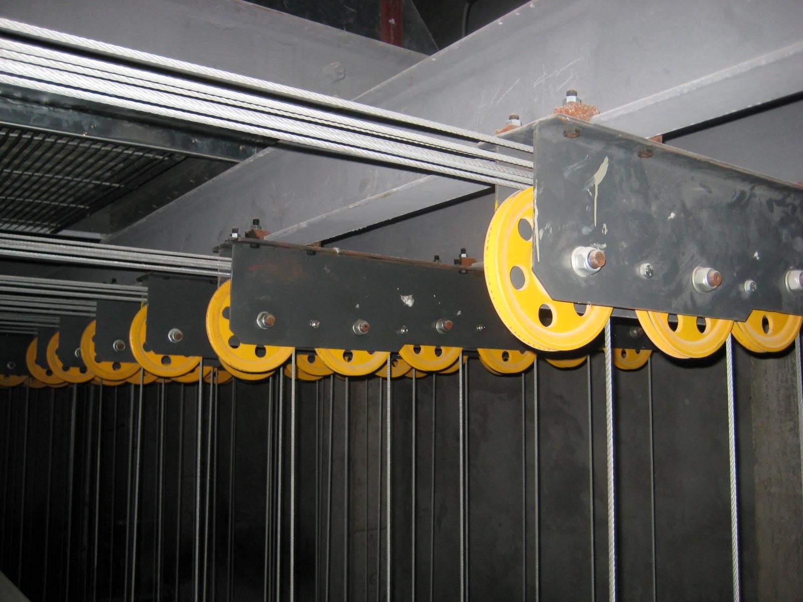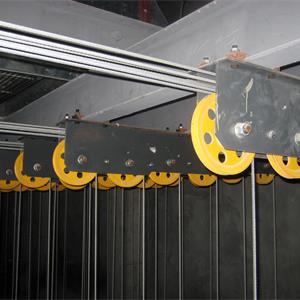 卷?yè)P(yáng)系統(tǒng):包括電動(dòng)機(jī)、減速器、雙制動(dòng)器、卷筒、滑輪組件、鋼絲繩和配件、輔助操作手輪等?;喗M件(一般)包括拐角滑輪、吊點(diǎn)滑輪。