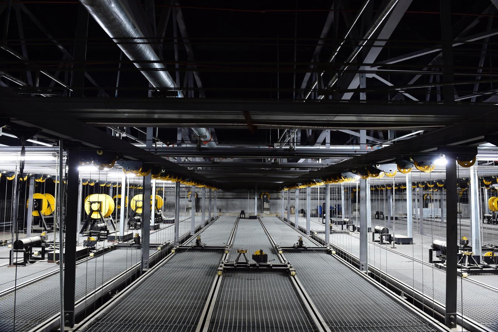設置在柵頂縱橫雙向軌道上的單點吊機固定在移動橫梁上,同時設有移動轉(zhuǎn)向滑輪組件,可以手動牽引使其沿軌道雙向移動,并設有鎖緊裝置。