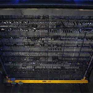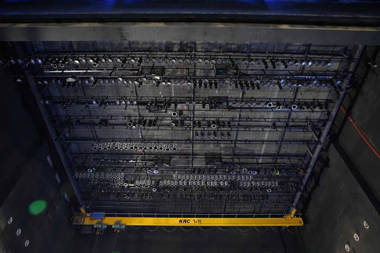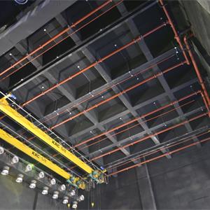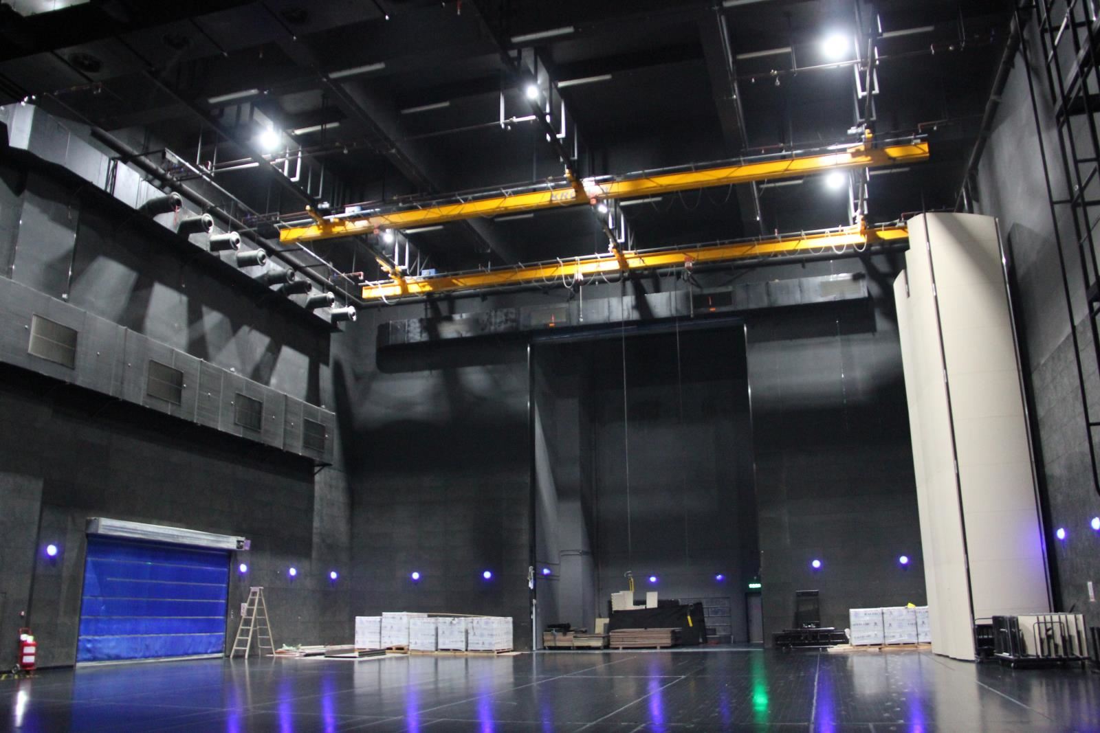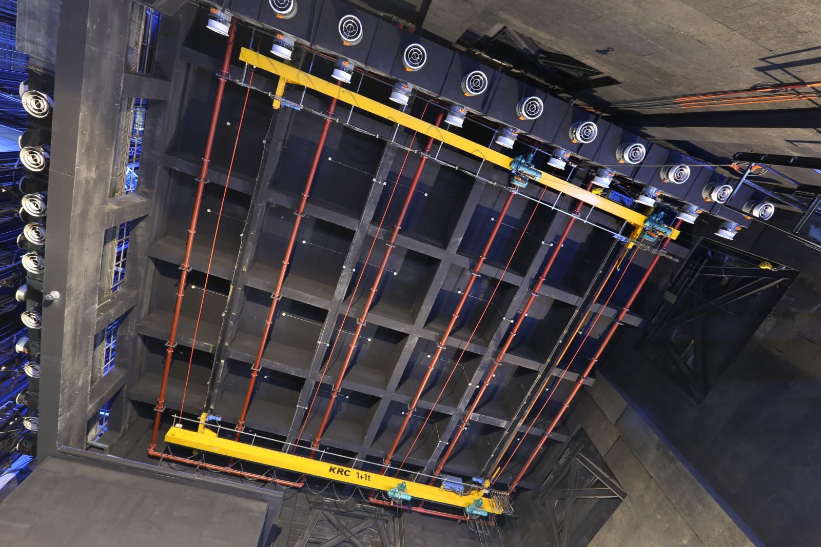 側(cè)臺(tái)裝景行車(chē)位于左右兩側(cè)側(cè)舞臺(tái)上空。行車(chē)用于大型或重型布景部件的裝配。