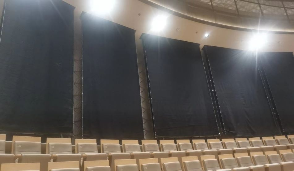 卷幕吸聲式聲學(xué)裝置通常設(shè)置于觀演區(qū)的兩側(cè)、后區(qū)或頂部,利用吸聲簾幕的升降改變吸聲或反射面積??梢园惭b于裝飾墻面外側(cè)(明裝),也可以安裝于透聲墻面與建筑墻體之間的聲學(xué)構(gòu)造內(nèi)(暗裝)。通常卷幕吸聲式聲學(xué)裝置數(shù)量較多,故一般配置獨立控制系統(tǒng)。